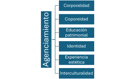 | La capacidad de agencia o agenciamiento se entiende como las libertades y oportunidades que tiene un individuo para tomar decisiones y actuar en un contexto, transformando situaciones que afectan a su comunidad a nivel social y ambiental. Implica la capacidad de razonar críticamente y llevar a cabo acciones intencionales. En el ámbito de la educación artística y ambiental, esto se manifiesta en la capacidad de realizar el potencial creativo y de contribuir a la construcción de una realidad institucional o social (Maras, 2018; Katz-Buonicontro, 2018; García-Calvo y Garzón-Barragán, 2023). | ||||