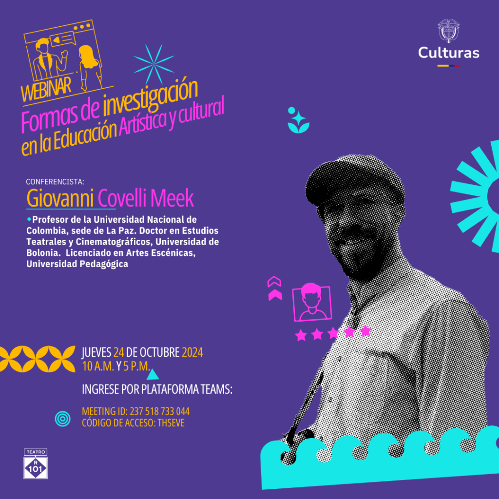 | Las formas de la investigación en Educación Artística: Algunos resultados de un piloto en formación artística y cultural y apuestas posibles. | 24 de octubre 2024 | Giovanni Covelli Meek |